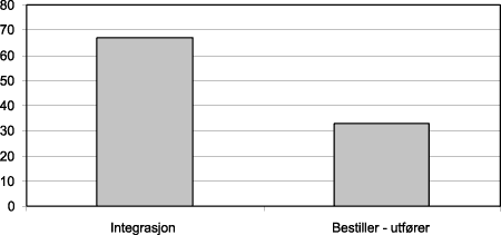 Det er som vi ser, relativt bred enighet om å beholde dagens integrerte modell. Om lag 2/3-deler av alle landets fylkespolitikerne står for et slikt syn. Det er heller ikke store variasjoner mellom fylkene, men i en fylkeskommune er det et flertall i vårt utvalg som ønsker en bestiller-utfører-modell. Det må understrekes at dette ikke er å sammenlikne med en avstemming i fylkestinget.