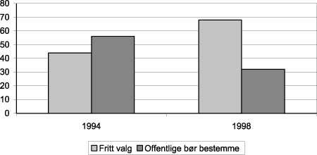 Figur 2.7 Fylkespolitikernes holdninger til fritt sykehusvalg. 1994 og 1998.