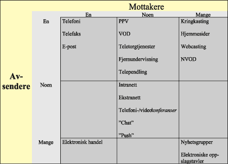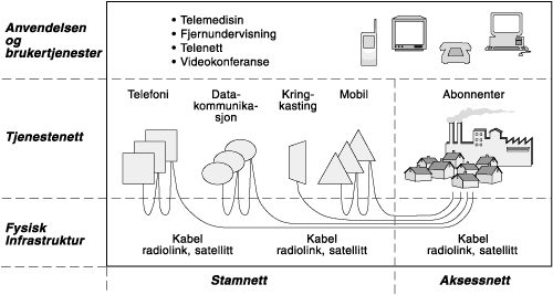Som nevnt har det tradisjonelt vært en kobling slik at en bestemt tjeneste har vært formidlet over et dedikert tjenestenett. Telefoni har vært formidlet gjennom telefonnett, kringkasting gjennom kringkastingsnett osv. Bakgrunnen for en slik utvikling med spesialiserte tjenestenett er bl.a. at det har utviklet seg ulike kommunikasjonsprotokoller i tilknytning til fremveksten av de enkelte tjenestene. Det har tradisjonelt også vært en sterk kobling mellom bestemte tjenestenett og visse typer fysisk infrastruktur og tjenestenettene. F.eks. ved at aksessdelen av telenettet har bestått av kobberkabler og at kabel-TV-sendinger blir formidlet over koaksialkabel. Som vi skal se i kapittel 3.3 er disse koblingene imidlertid i ferd med å løses opp.