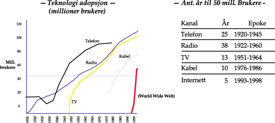 Gjennombruddet for Internett. En viktig faktor bak Internettets gjennomslagskraft er kommunikasjonsprotokollene som anvendes på Internett. Disse åpner for overføring og integrasjon av mange ulike typer tjenester. Internettprotokoller blir i økende grad tatt i bruk som standard for informasjonsoverføring.