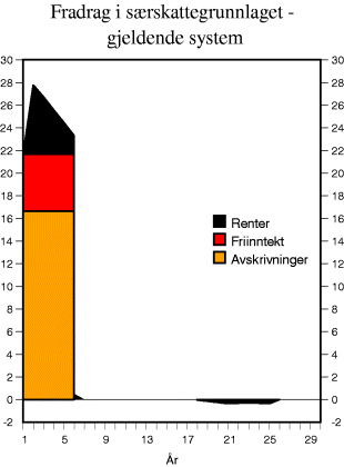 Figuren viser at alle skattemessige fradrag gis i løpet av 6-7 år fra og med det året investeringen foretas. Det gir tidlig skattedekning av investeringsutgiften dersom levetiden er lengre enn 6 år fra utgiften ble pådratt. Nominelt gis det fradrag for 130 prosent av investeringsutgiftene gjennom avskrivninger og friinntekt. I tillegg kommer rentefradraget som utgjør knappe 20 prosent (nominelt) av investeringsutgiftene.