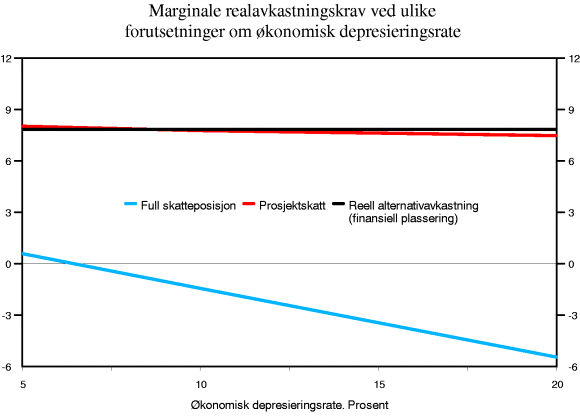 Med disse forutsetningene får vi et marginalt realavkastningskrav for bøyelasterinvesteringen på 6,7 prosent før vi tar hensyn til fordelen ved gjeldsfinansiering. Som følge av at avskrivningssatsen på 20 prosent er høyere enn den forutsatte depresieringsraten på 10 prosent, får vi altså at avkastningskravet i landskatteregimet er noe lavere enn alternativavkastningen. I kapittel 7 (boks 7.2) viser vi at virkningen av fordelen ved gjeldsfinansiering ved en investering i datterselskap, er å redusere det marginale avkastningskravet med 2,8 prosentpoeng med de forutsetningene som er valgt i basisalternativet for våre beregninger.