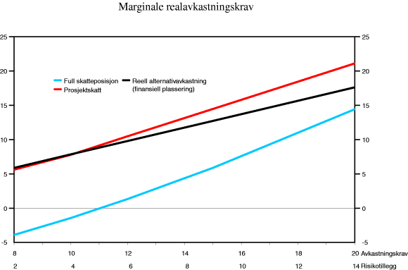 Våre beregninger for investeringer i petroleumssektoren sammenligner disse investeringene med en alternativ (finansiell) plassering med tilsvarende risiko. Avkastningen av den finansielle plasseringen skattlegges med alminnelig inntektsskatt. Dersom det marginale realavkastningskravet er lavt for en petroleumsinvestering, og lavere enn avkastningskravet for den alternative plasseringen, tyder det på at marginale investeringer blir for gunstig behandlet i petroleumsskatteregimet. Det gir sterke investeringinsentiver og kan føre til for høy kapitalbruk i sektoren. Omvendt vil et relativt høyt marginalt avkastningskrav tyde på en for ”streng” skattemessig behandling av investeringene i petroleumssektoren, slik at en risikerer å få for lave investeringer i forhold til det som er samfunnsøkonomisk lønnsomt.