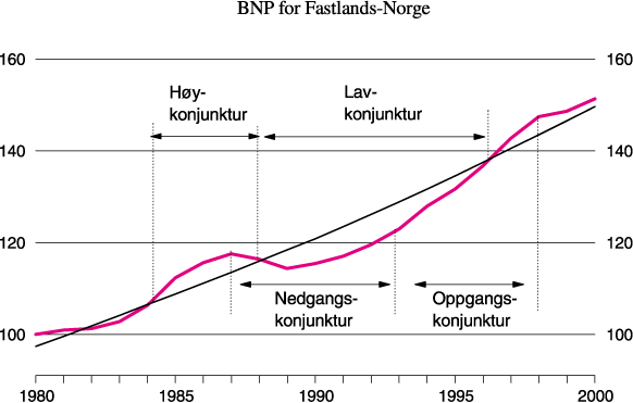 I boks 3.1 er utviklingen fra 1980 og fram til i dag delt inn i ulike konjunkturfaser. Hvis en ser bort fra nedgangskonjunkturen på begynnelsen av 1980-tallet, siden denne faller utenfor den tidsperioden som en her vil fokusere på, kan den videre utviklingen deles inn i fire konjunkturfaser: