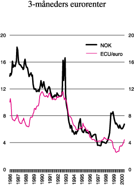 Som følge av de betydelige ubalansene i norsk økonomi, ble kronen satt under sterkt press våren 1986 . Det kortsiktige rentenivået steg dermed markert, jf. figur 3.7. I 1987 var den gjennomsnittlige rentemarginen i forhold til ECU om lag 8 prosentenheter. Etter innstrammingen av den økonomiske politikken og devalueringen av kronen i 1986 ble det ført en penge- og valutapolitikk med sikte på å stabilisere kronekursen. Etter hvert som troverdigheten til pengepolitikken ble gjenopprettet, ble renteforskjellen overfor utlandet gradvis redusert fra 1987 til 1990. Det europeiske rentenivået økte imidlertid markert som følge av konjunkturoppgangen i disse landene, slik at rentenivået holdt seg relativt høyt i Norge. Pengemarkedsrenten falt dermed klart mindre enn prisstigningen, slik at realrenten økte. Fram til 1986 var realrenten etter skatt negativ, men den steg til knapt 3 pst. i 1988 og videre til nesten 8 pst. i 1992, jf. figur 3.8. Den økte realrenten på slutten av 1980-tallet reflekterte dels økte realrenter internasjonalt, men kan i noen grad også tilskrives lavere prisvekst i Norge enn i andre europeiske land, noe som må ses i sammenheng med at norsk økonomi var inne i en lavkonjunktur.