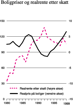 Figur 3.8 Realpris på boliger i annenhåndsmarkedet (1984 = 100) og realrente etter skatt (prosentenheter)1)