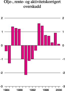 Etter flere år med ekspansive budsjetter, ble finanspolitikken strammet inn fra og med 1994. Målt ved den olje-, rente- og aktivitetskorrigerte budsjettindikatoren, ble finanspolitikken strammet inn tilsvarende om lag 4 pst. av BNP for Fastlands-Norge fra 1994 til 1998. Innstrammingen var særlig sterk de to første årene, men ble gradvis redusert utover i perioden. Finanspolitikken dempet dermed oppgangen i fastlandsøkonomien. I tillegg til en stram finanspolitikk, bidro økte skatte- og avgiftsinntekter som følge av konjunkturoppgangen til en kraftig bedring i det oljekorrigerte overskuddet på statsbudsjettet. Samtidig tok oljeprisen seg markert opp gjennom 1995 og 1996, noe som førte til en kraftig vekst i statens inntekter fra oljevirksomheten. De betydelige underskuddene på statsbudsjettet i årene 1991–1994 ble dermed snudd til overskudd fra og med 1995, jf. figur 3.13. I tråd med retningslinjene for Statens petroleumsfond, førte dette til at det i 1996 for første gang ble foretatt en netto avsetning til fondet.