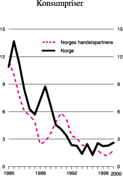 Prisstigningen avtok markert gjennom første halvår 1988, og var for første gang siden våren 1980 lavere enn hos handelspartnerne, jf. figur 3.10. Prisstigningen falt ytterligere på begynnelsen av 1990-tallet. Etter at en rekke europeiske land hadde gitt opp å holde faste valutakurser, ble svingningsmarginene for norske kroner suspendert i desember 1992. Kronen falt da noe i verdi, men pengepolitikken ble fortsatt rettet inn mot stabil valutakurs. Den lave pris- og kostnadsveksten ble videreført. Tilliten til norsk økonomi kom til uttrykk i et sterkt fall i både det kortsiktige og langsiktige rentenivået fra årsskiftet 1992–1993, i tråd med fallet i internasjonale renter.