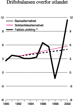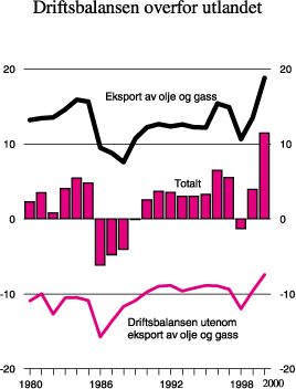 Driftsbalansen overfor utlandet bedret seg i årene etter 1986, jf. figur 3.11. Dette skyldes dels en kraftig vekst i eksporten som følge av bedret kostnadsmessig konkurranseevne og en internasjonal konjunkturoppgang, og dels en svak utvikling i importen som følge av konjunkturnedgangen i norsk økonomi. I tillegg økte oljeproduksjonen kraftig på slutten av 1980-tallet, noe som i vesentlig grad bidro til at underskuddet på driftsbalansen ble snudd til et overskudd i 1990. I perioden 1990–1995 hadde Norge et overskudd på driftsbalansen tilsvarende rundt 4 pst. av BNP.