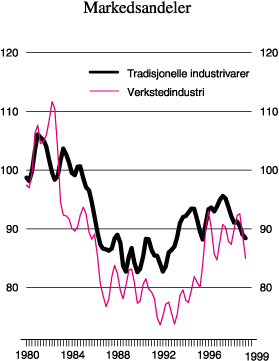 Eksportmarkedsandelen for norsk industri var relativt stabil i perioden 1986 til 1992, etter en klar nedgang i første halvdel av 1980-tallet, jf. figur 3.12. Fra 1993 til 1996 økte imidlertid markedsandelen betydelig, og da særlig for eksporten av verkstedsprodukter. Den økte eksportmarkedsandelen må ses i sammenheng med bedret kostnadsmessig konkurranseevne etter flere år med lav pris- og kostnadsvekst. De økte markedsandelene bidro til en relativt sterk oppgang i den tradisjonelle eksporten. Den gunstige utviklingen på eksportmarkedene bidro til en vekst i industriinvesteringene på knapt 13 pst. årlig fra 1993 til 1998. Oppsvinget i investeringene må ses i sammenheng med økt inntjening og kapasitetsutnyttelse i bedriftene som følge av redusert rentenivå, lav kostnadsvekst og økt etterspørsel både hjemme og ute. Den kraftige eksportveksten, oppgangen i investeringene og en oppgang i industrisysselsettingen på nesten 12 pst. tyder på en markert bedring i konkurranseevnen for norsk industri. Denne utviklingen står i klar motsetning til utviklingen midt på 1980-tallet.