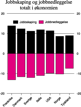Sammenliknet med andre OECD-land er det mye som er svært bra i norsk økonomi. Verdiskapingen i Norge er høy, og Norge ligger helt på topp når det gjelder andelen sysselsatte i befolkningen, samtidig som arbeidsledigheten er svært lav. Vi har også en meget lav langtidsledighet. Vår gode posisjon i internasjonal sammenheng er svært krevende å opprettholde over tid, blant annet fordi petroleumsinntektene etter hvert vil synke. Å holde seg i den internasjonale førstedivisjonen krever at vi hele tiden er på høyde med de land som gjør det best på ulike områder. Det ser ut til at den samlede jobbflyten, dvs. jobbskaping og jobbnedleggelser som andel av totalt antall jobber, er noe lavere i Norge enn i mange andre land. Slik det måles av OECD er stillingsvernet i Norge på nivå med Tyskland og Sverige, men strengere enn i Storbritannia og Danmark. Den gjennomsnittlige arbeidstiden i Norge er kortere enn hos de fleste av våre handelspartnere, men dette har først og fremst sammenheng med at yrkesdeltakelsen blant kvinner er høy og at kvinner i større grad arbeider deltid. Blant heltidsansatte er den årlige arbeidstiden om lag på linje med andre OECD-land.