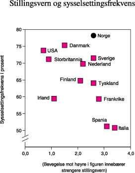 OECD har nylig foretatt en undersøkelse av stillingsvernet i de ulike medlemslandene. Ifølge denne undersøkelsen har landene i Sør-Europa gjennomgående det strengeste stillingsvernet, jf. figur 4.9. Norge rangeres sammen med bl.a. Sverige og Tyskland, og befinner seg nærmere de restriktive landene i Sør-Europa enn de mer liberale angloamerikanske landene. Ut fra figuren ser det ut til å være en tendens til at land med strengt stillingsvern gjennomgående har lave sysselsettingsfrekvenser. Sysselsettingsfrekvensen blir imidlertid påvirket av flere andre forhold enn stillingsvernet. Undersøkelsen fra OECD kan tyde på at et strengt stillingsvern øker sysselsettingen for menn i aldersgruppen 30–54 år samtidig som det kan føre til redusert sysselsetting for grupper som er på vei inn i arbeidsmarkedet, som ungdom og kvinner. For sistnevnte grupper er virkningene svært små. Totalt sett viser de statistiske analysene utført av OECD ingen klar sammenheng mellom stillingsvern og sysselsettingsfrekvens (Employment Outlook, juni 1999). OECD finner heller ingen sammenheng mellom stillingsvern og samlet ledighet. I Norge har vi en svært høy sysselsettingsfrekvens og et relativt strengt stillingsvern.