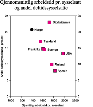 Det samlede arbeidstilbudet bestemmes av antall personer i arbeidsstyrken og av gjennomsnittlig arbeidstid . Gjennomsnittlig arbeidstid påvirkes blant annet av den avtalefestede arbeidstiden, andelen deltidssysselsatte, ferier, sykefravær, permisjoner og overtid. I OECD-området har det vært en langsiktig trend i retning av at de sysselsatte i gjennomsnitt jobber mindre. Det er imidlertid ikke i alle land hvor gjennomsnittlig arbeidstid er redusert. I både Sverige og USA er gjennomsnittlig arbeidstid høyere enn for 20 år siden. I USA må det for en stor del ses i sammenheng med at den enkelte arbeidstaker arbeider flere timer, mens økningen i Sverige må ses i sammenheng med at deltidssysselsatte jobber stadig mer. Gjennomsnittlig arbeidstid i Norge er svært lav i internasjonal sammenheng. Dette henger sammen med at andelen deltidssysselsatte er relativt høy, jf. figur 4.10.