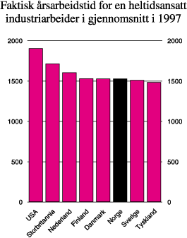 Hvis en sammenliknet den årlige arbeidstiden for arbeidstakere som arbeider et fullt årsverk, blir bildet noe annerledes enn ved sammenlikning av gjennomsnittlig arbeidstid pr. sysselsatt. I 1997 arbeidet en heltidsansatt industriarbeider i Norge mer enn både i Tyskland og Sverige, jf. figur 4.11. Også blant heltidsansatte i industrien har USA høyest arbeidstid.