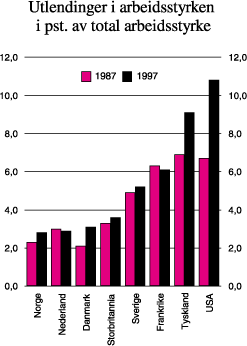 Andelen innvandrere i arbeidsstyrken har økt i de aller fleste land på 1990-tallet, men Norge har en lav andel innvandrere i arbeidsstyrken i forhold til mange andre land. Andelen innvandrere i arbeidsstyrken i Norge er på linje med Danmark, men ligger lavere enn i Sverige. Ulikheter i datakilder fører imidlertid at en må være noe varsom med å legge for stor vekt på forskjellene mellom land. For Norge sin del omfatter ikke tallene selvstendige næringsdrivende og arbeidsledige innvandrere. For enkelte andre land i figur 4.12 er antall arbeidsledige heller ikke inkludert i tallene. Tallgrunnlaget innebærer at arbeidsstyrken blant innvandrere i flere land er noe høyere enn det figur 4.12 gir uttrykk for, særlig gjelder dette Norge hvor bare antall arbeidstakere er inkludert i tallene.