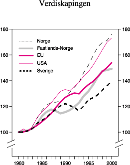 Bruttonasjonalproduktet (BNP) er et mål på verdiskapingen i et land, dvs. hvor store økonomiske verdier som skapes av virksomhetene og i offentlig sektor. Gjennom 1980- og 1990-tallet har BNP i Norge økt med til sammen nesten 80 pst., mens økningen i EU har vært nesten 50 pst og i USA nesten 70 pst., jf. figur 4.13. Den sterke veksten i verdiskapingen i Norge må ses i sammenheng med oppbyggingen av oljesektoren. Fra 1980 til 1999 har produksjonen av olje og gass økt med vel 300 pst., og oljesektorens etterspørsel etter varer og tjenester fra fastlandsøkonomien har økt betydelig.