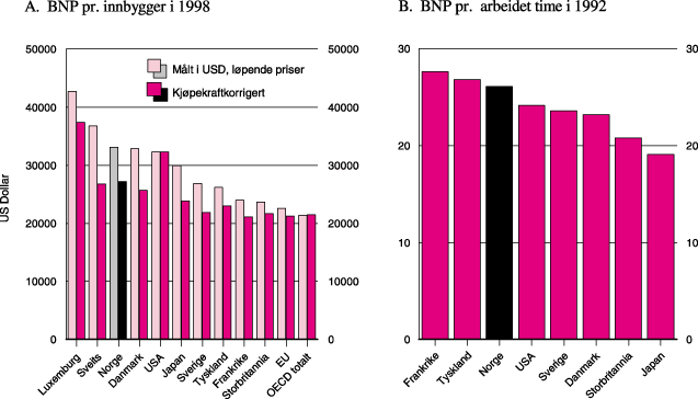 I Norge er nivået på BNP pr. innbygger relativt høyt. Målt i felles valuta var det i 1998 bare Sveits og Luxemburg som hadde et høyere nivå blant OECD landene, jf. figur 4.14a. Forskjeller i prisene mellom land er ikke fullt ut reflektert i valutakursene og svekker dermed sammenliknbarheten mellom land. For å ta hensyn til forskjeller i prisnivå mellom land, beregnes såkalte kjøpekraftskorrigert BNP. Kjøpekraftskorrigering innebærer at det justeres for forskjellene i prisnivået mellom land ut fra hvor mye en gitt kurv varer koster i de forskjellige landene. Kjøpekraftskorrigering innebærer betydelige metodiske problemer, så resultatene må tolkes med varsomhet. I forhold til OECD- gjennomsnittet er prisene relativt høye i Norge, uten at dette er fullt ut reflektert i valutakursen, slik at kjøpekraftskorrigering medfører en betydelig nedjustering. Høyt prisnivå kan blant annet skyldes svak konkurranse mellom innenlandske produsenter som i liten grad utsettes for konkurranse fra utenlandske produsenter. Men også kjøpe-kraftskorrigert ligger BNP pr. innbygger i Norge svært høyt. Det er bare USA og Luxembourg som ligger foran, og nivået i Norge ligger vel 20 pst. over gjennomsnittet i EU.