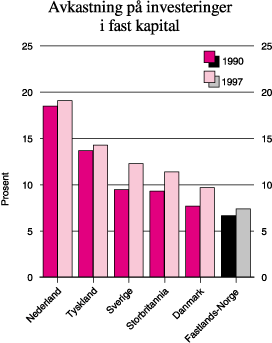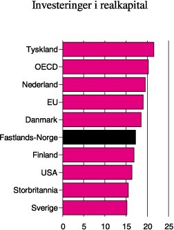 I avsnitt 4.2 ble en rekke forhold knyttet til arbeidskraften belyst. Blant annet ble det pekt på at sysselsettingen i Norge er svært høy i internasjonal sammenheng. Investering i realkapital , dvs. den delen av verdiskapingen som brukes til å øke realkapitalbeholdningen, har i perioden 1991–1997 i gjennomsnitt vært noe lavere i Fastlands-Norge enn for EU, jf. figur 4.15. De siste årene har imidlertid investeringsraten i Fastlands-Norge vært høyere enn i EU, som følge av at investeringsnivået har tatt seg markert opp. Det må blant annet ses i sammenheng med sterk produksjonsvekst gjennom flere år i norsk økonomi, og mangel på flere typer arbeidskraft.