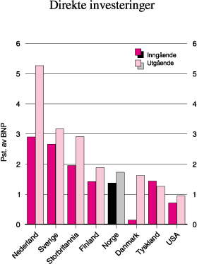 Hvor stor avkastning en investering gir, er blitt stadig viktigere for hvilke land en virksomhet velger å investere i. En direkte investering er en investering over landegrensene der investor har til hensikt å opprette en varig økonomisk forbindelse og utøve innflytelse på virksomheten i investeringsobjektet. I statistikken som er gjengitt i figur 4.18 operasjonaliseres denne definisjonen ved at en direkte eierandel på 10 pst. eller mer regnes som en direkte investering. Hoveddelen av de direkte investeringene er knyttet til kapasitetsutvidelse eller eierskifte i allerede eksisterende bedrifter og ikke til nyetablering av bedrifter. En sammenlikning av størrelsen på de direkte investeringene, regnet i prosent av BNP, viser at utenlandske investeringer i Norge er om lag på samme nivå som utenlandske investeringer i Finland og Tyskland, jf. figur 4.18. En legger også merke til at med unntak av Tyskland, er utgående investeringer større enn inngående investeringer. Figur gir tall for 1997. For årene deretter har de inngående investeringene også i Norge vært høyere enn de utgående. Hvis en ser hele verden under ett, må summen av inngående direkte investeringer være lik summen av utgående direkte investeringer. Direkte investeringer er nærmere omtalt i kapittel 5.