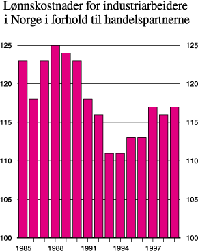 Lønnskostnadene er den enkeltfaktoren som betyr mest for virksomhetenes kostnader. Derfor er lønnskostnadene viktige for virksomhetenes lønnsomhet og derigjennom bedriftenes investeringsbeslutninger, herunder valg av land. De totale lønnskostnadene består både av de direkte lønnskostnadene og de indirekte kostnadene som arbeidsgiveravgift, sykelønnskostnader, pensjonskostnader, samt andre pålagte eller framforhandlede rettigheter. Tall for lønnsnivået for industriarbeiderne tyder på at lønnskostnadsnivået i Norge i 1999 for denne gruppen, lå 17 prosent over gjennomsnittsnivået for handelspartnerne målt i felles valuta, jf. figur 4.20. Nivået er noe høyere enn i perioden fra 1993 til 1996, men klart lavere enn på slutten av 1980-tallet. Tallmessige indikasjoner for enkelte land innenfor EU-området peker i retning av at forskjellen i lønnskostnadene i industrien mellom Norge og våre handelspartnere ville vært vesentlig mindre dersom funksjonærene hadde vært med i sammenlikningene. Direkte sammenliknbare nivåtall for arbeidere og funksjonærer totalt foreligger foreløpig ikke, og internasjonale sammenlikninger av lønnsnivået for andre sektorer er vanskelig fordi statistikkgrunnlaget er mangelfullt.