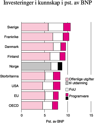 Investeringer i kunnskap er høyere i Norge enn i gjennomsnittet for OECD-området. Særlig er offentlige utgifter til utdanning på et høyt nivå i Norge, og utdanningsnivået, målt ved andelen av befolkningen med minimum videregående utdanning, er høyt i internasjonal sammenheng. På den annen side ser det ut til at utgiftene knyttet til innovasjon er relativt lave i Norge. Gjennom oppgangskonjunkturen på 1990-tallet har investeringsnivået i realkapital for Fastlands-Norge tatt seg opp til et høyt nivå internasjonalt sett, men avkastningen av realkapitalen ser ut til å være klart lavere i Norge i det som er vanlig internasjonalt. Lønnsnivået for industriarbeidere i Norge er klart høyere enn hos våre handelspartnere. Dersom en ser på de samlede lønnskostnadene for industrien inkludert funksjonærer, er trolig forskjellen i forhold til handelspartnerne vesentlig mindre. Direkte sammenliknbare nivåtall for arbeidere og funksjonærer totalt foreligger foreløpig ikke, og internasjonale sammenlikninger av lønnsnivået for andre sektorer er også vanskelig fordi statistikkgrunnlaget er mangelfullt.