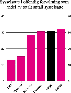 Norge er blant de land i OECD-området som har høyest andel sysselsatte i offentlig sektor , jf. figur 4.24. Andelen sysselsatte i offentlig sektor er mer enn dobbelt så høy i Norge som i USA, mens Danmark og Sverige ligger på nivå med Norge. Etterspørselen etter arbeidskraft i helse- og sosialsektoren vil øke betydelig framover, blant annet som følge av at befolkningen eldes. I tillegg vil en videreføring av dagens tilbud innen helse- og sosialsektoren og gjennomføringen av vedtatte reformer i det kommunale tjenestetilbudet (bl.a. full barnehagedekning, handlingsplan i eldreomsorgen og psykiatriplanen) bidra til en kraftig økning i behovet for arbeidskraft innen kommunal sektor framover.