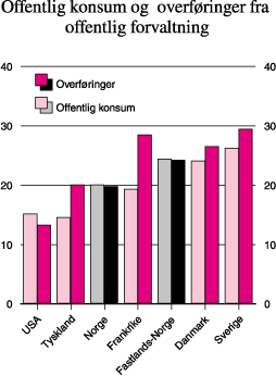 Offentlige utgiftene kan deles i offentlig konsum og offentlige overføringer . Offentlig konsum angir hvor store ressurser offentlig sektor forbruker, for eksempel til forsvar, politi og i helsevesenet, mens offentlige overføringer angir hvor store ressurser som omfordeles i privat sektor, for eksempel pensjonsutbetalinger og overføringer til landbruket. I Norge utgjør både offentlig konsum og offentlige overføringer om lag 20 pst. av BNP, som er lavere enn i Sverige og Danmark, men høyere enn i USA og Tyskland, jf. figur 4.25. Hvis en alternativt ser konsum og overføringer i forhold til BNP for Fastlands-Norge, viser figur 4.25 at Norge fremdeles ligger noe lavere enn Danmark og Sverige.