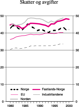 Det offentlige finansierer konsum og overføringer vesentlig ved skatter og avgifter. I Norge har skatte- og avgiftsnivået, målt i forhold til samlet BNP, ligget på om lag det samme nivået som gjennomsnittet av EU-landene de siste årene. Skattenivået i Norge er lavere enn i gjennomsnittet for de nordiske landene, men vesentlig høyere enn gjennomsnittet for industrilandene, jf. figur 4.26. Det må ses i sammenheng med at tjenester innenfor helsesektoren og innen undervisning i Norden i stor grad er et offentlig ansvar, mens det mange andre land i større grad blir produsert i offentlig sektor og finansiert ved brukerbetalinger. Hvis en holder oljesektoren utenom, er skatte- og avgiftsnivået i Norge om lag på samme nivå som gjennomsnittet i de andre nordiske landene.