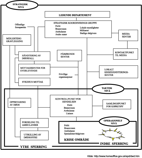Strukturen for å håndtere en krisesituasjon er delt inn i operative, taktiske og strategiske nivåer, uavhengig av om omfanget av krisen er lokal eller omfattende. Hovedhensikten med denne inndelingen er å ha strukturell fleksibilitet med hensyn til lokale, regionale og sentrale administrative forskjeller og endringer i omstendighetene rundt en krise.