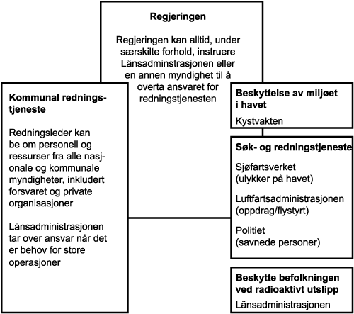 Ansvarsfordelingen mellom sentralt, regionalt og kommunalt nivå er regulert i en ny lov om det sivile forsvaret fra 1994 og redningstjenesteloven fra 1986. I henhold til dette lovverket skal de sentrale myndighetene formulere kravene og målsettingene for rednings- og beredskapssystemene til kommunene, i tillegg til å fordele ressurser til kommunene, forskjellige statlige myndigheter og private aktører. Kommunene er på sin side ansvarlige for å organisere en redningstjeneste innenfor sitt geografiske område. Forskjellige statlige myndigheter fører tilsyn med dette arbeidet.