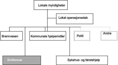 Krisehåndteringssystemet er basert på den generelle nivåinndelingen i samfunnsstrukturen, og ved behov trekkes håndteringen av en hendelse oppover i systemet. Ved kriser er det først og fremst kommunene som har ansvaret for krisehåndteringen. Det finnes et koordineringssenter for kriser i hver kommune, og et eventuelt redningsarbeid ledes av brannsjefen. Et hjelpemiddel for de lokale krisehåndteringsorganisasjonene er de 52 nødsentralene som mottar nød- og ulykkesmeldinger 24 timer i døgnet. Disse nødsentrene er telekommunikasjonssentraler for redningstjenesten, og formidler melding videre til kommunene. For de kommunene som samarbeider om nødtjenestene vil felles ressurser benyttes til å få kontroll med situasjonen.