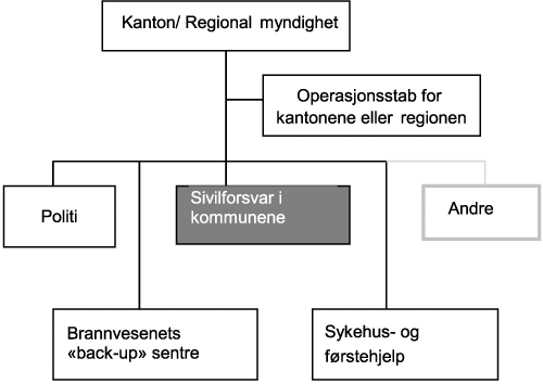 I kommunene samordner kommunedirektøren de ulike sektorenes virksomheter og beredskapsoppgaver. Planleggingen på området må godkjennes av de normale myndighetsorganene i kommunen.