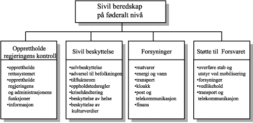 Riksdagen har identifisert 18 samfunnsområder/funksjoner som er av særskilt betydning i en krisesituasjon. Det er utnevnt myndigheter som har ansvaret for all sivil beredskapsplanlegging innen hver av funksjonene. For eksempel er ÖCB koordinerende myndighet for den sivile beredskapsplanleggingen og sivilforsvaret, Statens energimyndighet koordinerer energiforsyning, Räddningsverket koordinerer redningstjenesten osv. En komite er i ferd med å gjennomgå og evaluere denne systeminndelingen. Hensikten er å utarbeide et bedre og mer tidsmessig system.