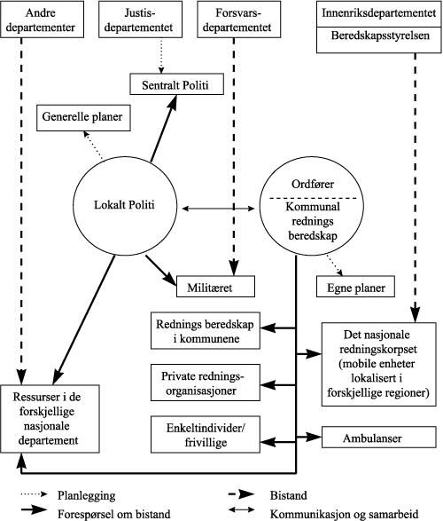 Hvert departement har ansvar for beredskapsarbeid og krisehåndtering innen sine sektorer. Direktoratet for offentlig orden og sikkerhet i Innenriksdepartementet har en koordinerende funksjon på området, i tillegg til et generelt ansvar for beredskapsarbeid. Hovedtyngden av kriseplanleggings- og redningsarbeidet er imidlertid lokalt forankret, og kommunene har egen branntjeneste og politistyrke. Brannvesenet er kjernen i organisasjonsstrukturen, og har en koordinerende rolle i å forberede og implementere beredskaps- og krisehåndteringsplaner.