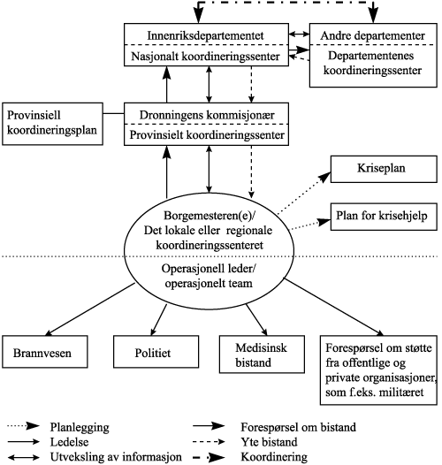 Det administrative og operasjonelle rammeverket i forbindelse med kriseplanlegging og krisehåndtering, er fastsatt i lov om branntjenester og kriseloven for beskyttelse av befolkningen. Begge lovene trådte i kraft i 1985, og fordeler hovedansvaret for brannvern og krisehåndtering til lokale myndigheter. Lovene regulerer også hendelser som kan kreve koordinering fra forskjellige myndigheter, og i henhold til kriseloven skal kommunene utvikle beredskapsplaner, krisehåndteringsplaner og provinsielle koordineringsplaner. 12 Ved lov om medisinsk bistand ved kriser er også helsevesenet gitt ansvar for en vesentlig del av beredskapssystemet. Til sammen utgjør brannvern, polititjenester og medisinsk nødhjelp et integrert system med fokus på fredstidskriser.
