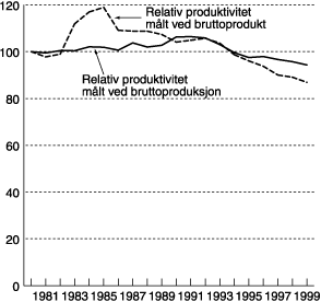 2) I perioden 1996–1999, hvor det ikke foreligger produksjonstall for handelspartnerne, er produktiviteten for handelspartnerne regnet ut med utgangspunkt i tall for bruttoproduktet.