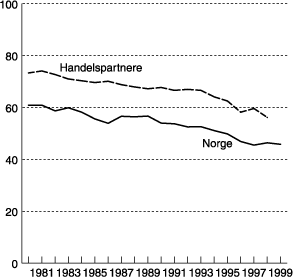 Siden den økonomiske utviklingen er kjennetegnet ved økt internasjonal spesialisering, vil hjemmemarkedsandelene falle trendmessig. Norske hjemmemarkedsandeler bør derfor sammenliknes med hjemmemarkedsandelene hos handelspartnerne, jfr. figur 5.4. Avvik i enkeltår kan ha sammenheng med at konjunkturutviklingen ikke er i fase i Norge og hos handelspartnerne. Ifølge foreløpige nasjonalregnskapstall har hjemmemarkedsandelene for de fleste industrivarer falt med om lag 1 prosent fra 1997 til 1999. De siste ti årene er det i første rekke produsenter av metaller, kjemiske og mineralske produkter og treforedlingsprodukter som har hatt de største tapene av markedsandeler, jfr. tabell 9.10 i vedlegg 9.