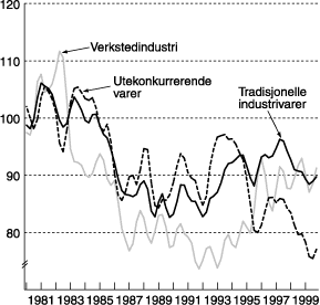 Veksten i timelønnskostnadene i norsk industri var høyere enn hos handelspartnerne både i 1998 og 1999. Svekkelsen av kronekursen i disse to årene bidro imidlertid til at de relative timelønnskostnadene regnet i felles valuta var om lag uendret fra 1997 til 1999.