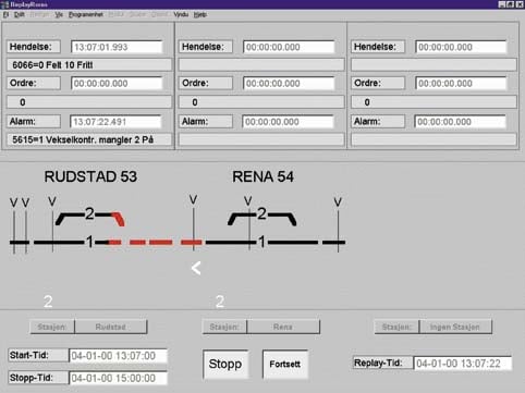 Figur 4.2 Oversiktsbilde for strekningen Hamar – Tolga. Nederst på skjermen et eksempel på en feil- melding