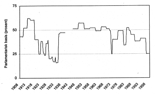 Figur 3.1 Parlamentarisk basis for norske regjeringer 1908–2000