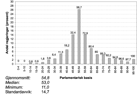 Norge preges i stadig sterkere grad av mindretallsparlamentarisme. Vi må tilbake til årene 1983–85 for å finne en regjering med et stortingsflertall i ryggen. De ti siste stortingsvalgene har alle resultert i parlamentariske situasjoner uten noe flertallsparti, og det typiske har vært at mindretallsregjeringer heller enn flertallskoalisjoner er blitt dannet 2 . Av Figur 1.1 fremgår det hvilken parlamentarisk basis forskjellige regjeringer har hatt siden Gunnar Knudsen inntok statsministerstolen i 1908. Størstedelen av tiden har det vært mindretallsstyre. Vi legger imidlertid merke til at mindretallsregjeringene i etterkrigstiden gjennomgående har hatt en mer solid basis enn mellomkrigstidens regjeringer. Selv Kjell Magne Bondeviks regjering, med kun en fjerdedel av Stortinget i ryggen, ligger et godt stykke unna mellomkrigstidens bunnoteringer