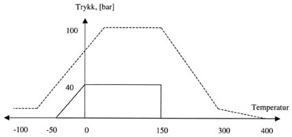 Figur 6.3 Spesifisert bruksområde med hensyn til temperatur og trykk (ref. 1). De heltrukne linjene viser maksimalt trykk og temperatur pakningen skal tåle over lang tid, mens de stiplede linjene representerer området som pakningen fortsatt skal fungere som spesifisert, men da kun i kort tid