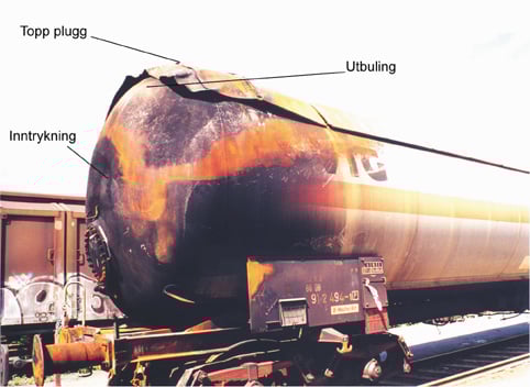 Den observerte utbulingen på tanken til vogn nr. 1 er mest sannsynlig et resultat av plastisk deformasjon som følge av høy temperatur og høyt trykk under brannen. Utbulingen indikerer derfor at tankmaterialet har vært overbelastet med hensyn til plastisk deformasjon. Testresultater fra lignende materialer viser at både flytegrense og strekkfasthet avtar betydelig ved opphøyde temperaturer samtidig som forskjellen mellom disse størrelsene blir liten. De nevnte testresultatene indikerer derfor at tankmaterialet vært nær bruddbelastning under brannen.