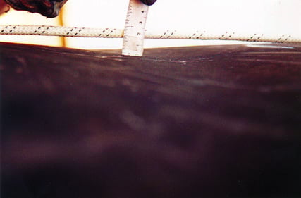 Figur 6.7og figur.6.8 viser nærbilder av inntrykningen observert over mannhullet. Figur 6.8 viser at tankmaterialet har blitt trykket inn ca 1,5 cm i dette området.