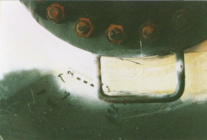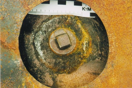 Figur 6.9 og figur 6.10 viser topp-pluggen på tanken til vogn 1 før og etter åpning. Ingen pakning ble observert mellom pluggens flens og tankoverflaten.