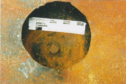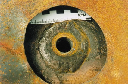 To av boltene til mannhull-lokket var skadet. Én var revet av i plan med lokkets overflate, mens den andre var sterkt deformert.