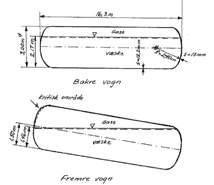 Vognene var fylt med propan, og væskenivået i tankene når tankene stod horisontalt nådde en høyde fra bunnen på ca. 2,17 m. Diameteren på tankene var 3,0 m. Dette betyr at når vognene stod horisontalt ville det bare være gass helt øverst i tanken.