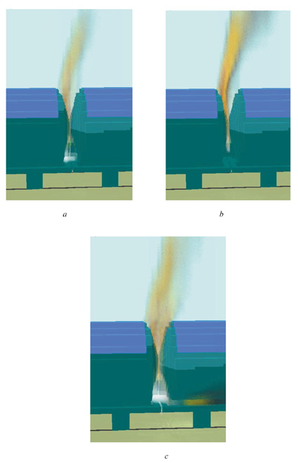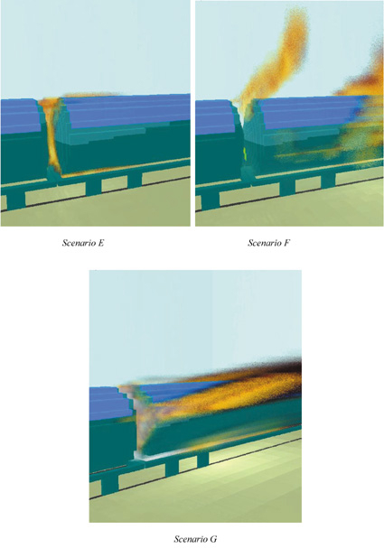 Lekkasjepunktene er plassert i toppen av flensen på enden av tankene. Lekkasjen er modellert svakt usymmetrisk slik at flammen bøyer av litt mot høyre sett mot fremre vogn i vindretningen, og det er tatt hensyn til at lekkasjepunktene er noe forskjøvet i høyderetningen for de to tankene.