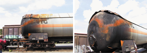 Som konsekvens av dette er det fremre vogn, den vognen som hadde det laveste væskenivå, som var mest utsatt. Våre observasjoner av vognene etter ulykken viser at en utbuling av beholderen på fremre vogn hadde funnet sted, noe som indikerer at en har vært i faresonen.