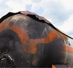 Den andre konsekvensen av varmeoverføringen er at stålmaterialet i tankene varmes opp. Hvis stålmaterialet varmes opp til ca. 500 °C vil styrken reduseres med ca. 55 %, mens ved en temperatur på ca. 700 °C vil styrken i materialet være redusert til i området 20–15 % av den opprinnelige styrke. Et slikt tilfelle kombinert med tilstrekkelig trykkoppbygning inne i beholderen ville kunne få den katastrofale følge at beholderen ville briste, med påfølgende ekstrem brannutvikling.